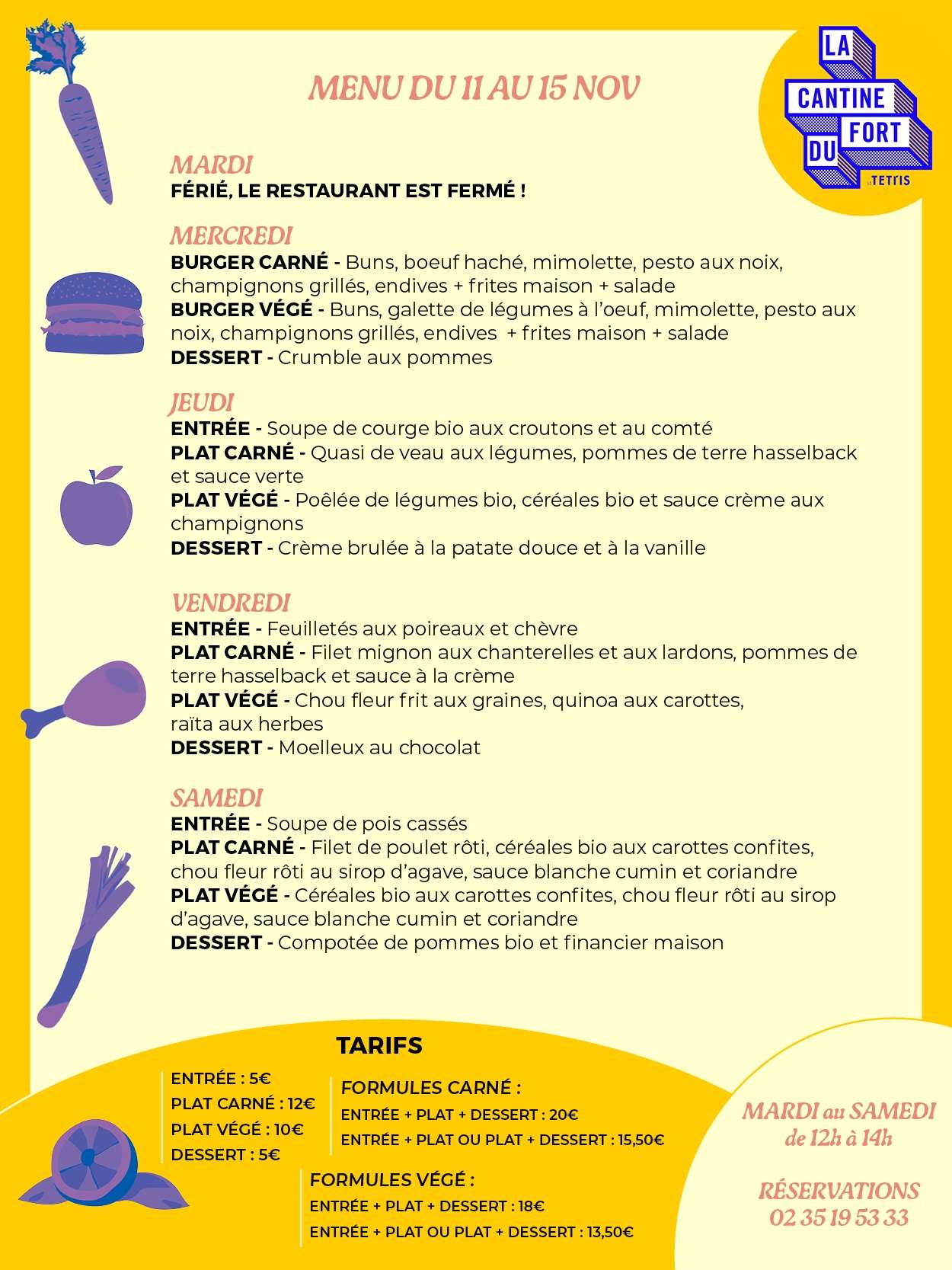 Retour La Cantine du Fort LA CANTINE DU FORT Menu du 11 au 15 novembre ELIE.FLORA Agenda Ven. 14 Nov. 20:00 Le CEM et Le Tetris présentent ROADRUNNERS Dim. 16 Nov. 18:00 FRANKIE AND THE WITCH FINGERS + Opinion Mer. 19 Nov. 20:00 MIEL DE MONTAGNE + MOOREA