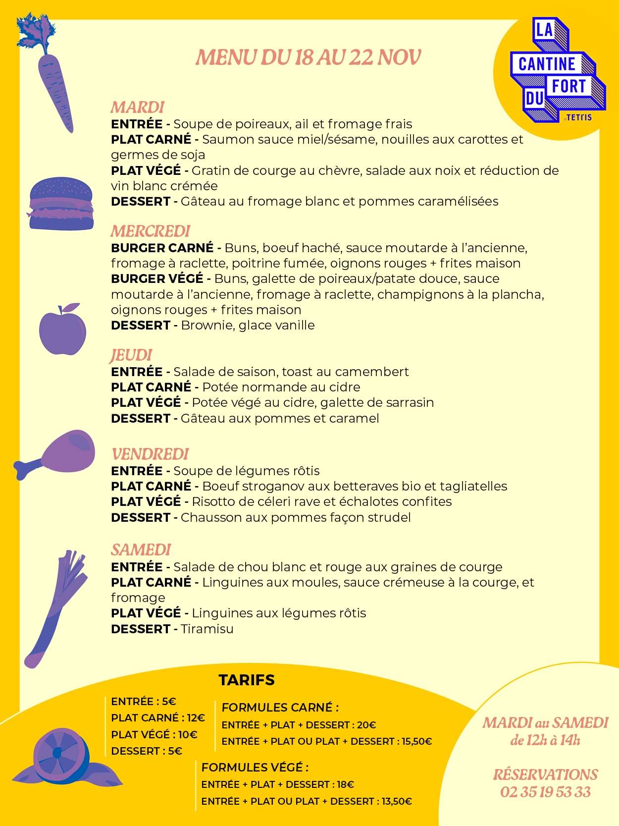 Retour La Cantine du Fort LA CANTINE DU FORT Menu du 18 au 22 novembre ELIE.FLORA Agenda Mathieu Zazzo Ven. 21 Nov. 20:00 THE LIMIÑANAS + Ménades Sam. 22 Nov. 14:00 APOCALYPSE METAL FEST #4 Mer. 26 Nov. 20:00 LES FEMMES S'EN MÊLENT PAIN MAGAZINE + Ellah A. Thaun