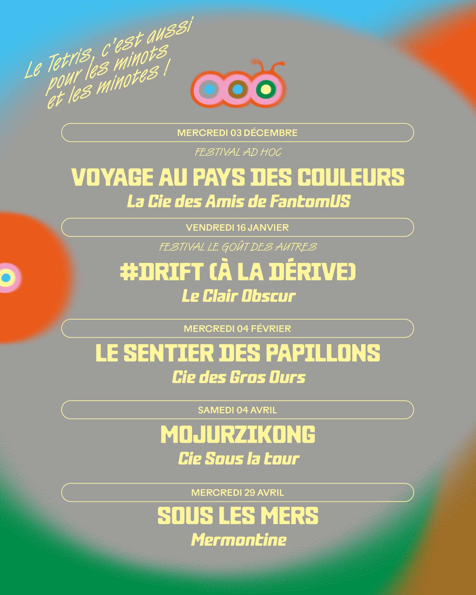 Sur la saison 2025/26, Le Tetris propose une série de voyages hauts en couleurs pour emmener les enfants vers de contrées oniriques. Chansons douces expérimentations sonores ou pop psyché, tous les sons s'offrent aux petites oreilles !
